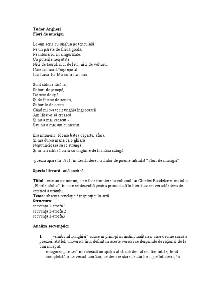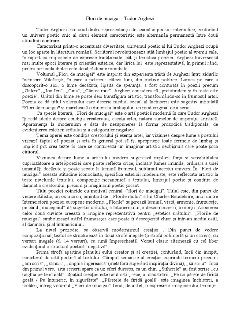 Licenta Poetica Lui Tudor Arghezi In Flori De Mucigai Romana